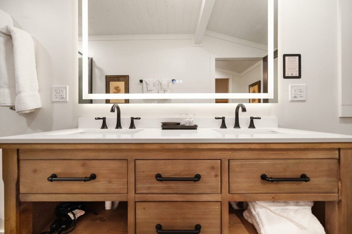 The LeConte Cabin is the largest of our accommodations at Dancing Bear Lodge, and located closest to our award-winning Appalachian Bistro (view our Property Map here). The LeConte Cabin features an open floor plan with a floating wall separating the bedroom from the den and will accommodate a maximum of 2 guests. You will enter the cabin in the den where you will find a large leather sofa and an HD television in front of the stacked stone wood burning fireplace. The King Bed is located on the other side of the floating wall with an HD television. From the den, you will see the newly renovated full kitchen and bathroom, which features large LED mirrors in the dressing area and a walk-in shower.